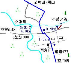 ■木々に囲まれた不動ノ滝 雑木林の中に隠れるように不動ノ滝は存在します。 川に降りるための階段も壊れかけながらあり、滝のすぐ下まで行けます。