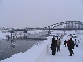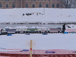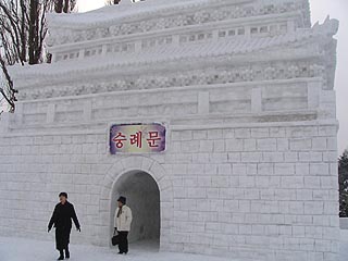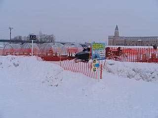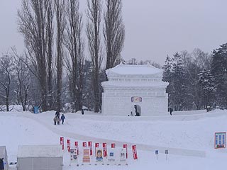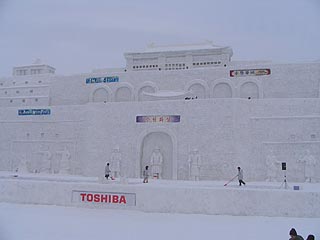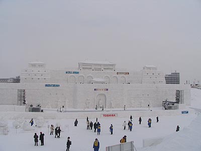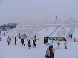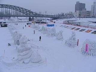 メインステージの大雪像は韓国の水原華城でした。海外の名所の雪像が造られていることに外国人観光客の増加を感じることができます。ステージが使用されている場合を除き雪像の上部にも上ることができ、石狩川や旭橋の風景も楽しむことができます。