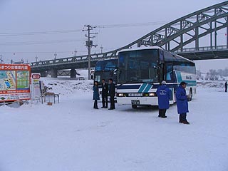 旭川冬まつり期間中は旭川駅→旭川冬まつり旭橋河畔会場→旭山雪の村・旭山動物園東門→旭川駅を結ぶ循環バスが運行されます。バスは1台〜3台程度で満員の場合は増車の手配がされます。旭川冬まつり旭橋河畔会場から乗車する場合は駅からのバスは20分の停車時間を利用して会場を見学する人も多く、出発が少々遅くなり、かつ混雑する可能性があります。旭橋近くに停留所があります。平成19年には8本程度運行。