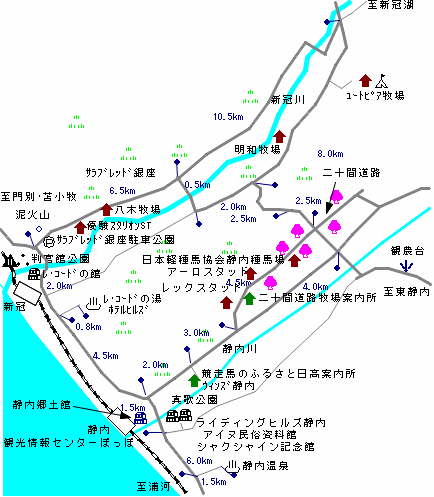新冠川に沿う道路に牧場が続きサラブレッド銀座と呼ばれています。 オグリキャップで有名な優駿スタリオンステーションや馬の川渡りで有名な八木牧場などがあります。