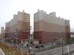 室蘭市の東町には市営住宅が立ち並ぶエリアが数箇所あります。写真は東町大和団地で18棟の市営住宅と集会所などが集まっています。間取りは浴室なしの2DK。室蘭市は浴室なしの市営住宅を減らすために東町大和団地、汐見団地の建替事業が進められていて寿町に7F、74戸の市営住宅(12-K-3))が平成25年度に完成しました。令和元年5月現在、東町たいわ団地1号棟、2号棟が完成し、3号棟が建設中です。公共建築物適正化計画(平成29年3月)によるとその後、4号棟、5号棟が令和5年度までに完成予定です。古い市営住宅は玉突きで順次解体が進んでいます。