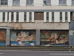 東町汐見団地はひとつの区画に児童公園を中心に5棟の市営住宅が取り囲むスタイル。間取りは浴室なしの2DK。1階は店舗が入っていましたが多くの商店は撤退していて、シャッターの絵が逆にかつての室蘭の繁栄を感じさせます。