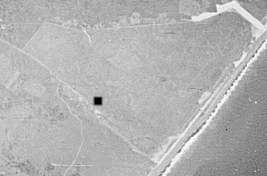 写真は昭和19年に陸軍により撮影された航空写真。敷地の境界は明確に認めることができます。現在残る痕跡は四角で記した場所にある燃料庫のみで、昭和30年代に濃霧を防ぐための地山造林事業によって整備された町有林が境界に沿って植林されて、かつての様子を僅かに今に伝えています。現在の土地利用は農家1戸、牧草地、町有林。