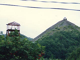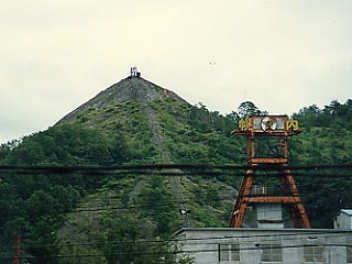 北炭幌内入気立坑櫓とその背後にそびえるボタ山。立坑櫓は北炭幌内鉱と新幌内鉱の集約に伴い昭和42年に建設されたもので合掌型とよばれる形式のもの。写真は昭和60年に幌内線車内より撮影。今もその雄姿は健在です。