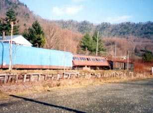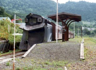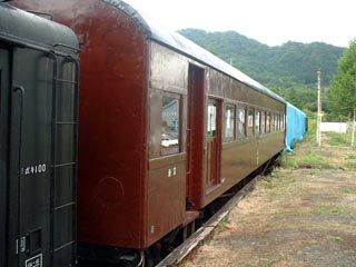 平成15年8月の南大夕張駅を訪問時の様子です。1両目の客車(スハニ6)は保存活動の成果として車両の塗りなおし等が行われ内部も一般公開されています。継続的な保存活動を行っている方々の努力には頭が下がる思いがします。ブルーシートが掛けられた残る2両は損傷も激しいとのことで保存にはさらなる困難が立ちはだかっているのです。