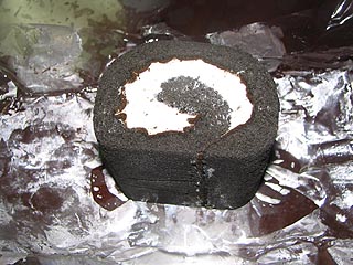 函館空港で見つけて購入した一品です。素朴なつくりでロールケーキのロールの部分にいかすみパウダーが混ぜられていて黒いのです。いかすみの味と香りがほんの僅かですが感じられるところが微妙です。冷蔵3日、冷凍2ヶ月の賞味期限は余裕があり、冷凍のまま切り食べるのがアイスクリーム風で実はおいしい。製造は水野屋。 いかすみロールケーキ(楽天)