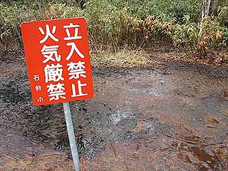 さらに少し先に行った左手には今も原油が湧出する地点があります。ぷくぷくと湧き出ている様を見ることができます。そして脇には立入禁止火気厳禁の看板がありました。