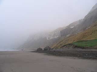 室蘭半島の太平洋側は険しい断崖が続いていて、その入口にイタンキ浜は位置しています。そのため断崖の直下の海岸線を歩いていくことができます。その気安さから朝から散歩する人も多くいました。訪れたのは早朝だったためまだ霧が一帯を覆い、どんな風景なのかはおぼろげにしか知ることはできませんでした。