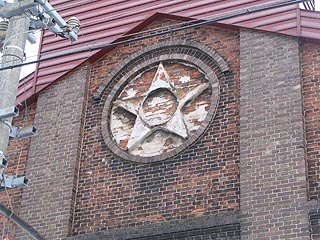 北炭の社紋が建物の両側の上部2箇所に見ることができます。片面は写真のように立体的で立派なものですが、反対側は平面状で当時のものが崩れてそのようになったのか、それとも当初からそのような形だったのかわかりません。また煉瓦の上部の補強のために様々な細工がしてあるのがおもしろい。
