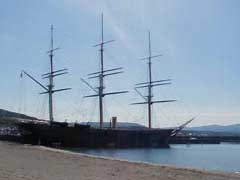 かもめ島の入口に係留されているのは開陽丸。徳川幕府最後の軍艦で残っていた資料により復元されました。館内は展示室にもなっています。