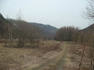 写真左のように駅から400m程北に行った先に左に折れる道があります。ここで線路を越えさらに利別川を越えることができるのです。そして写真右のように線路を越えた先には南に向かう道がさらに分岐します。この付近に水準点があるはずでこのダートがかつての南北道路の今の国道242号だったのでしょう。今では荒れ地を貫き林に消えていくのみです。またかつての東西の川越えの道はもう少し南側にありました。