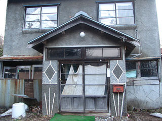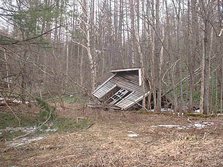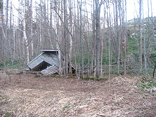 その道を上ったところには崩れた廃屋が一棟、林の中に佇んでいました。この建物が昭和39年に廃校になった川上小学校です。40年の月日を経て未だに校舎は痕跡を残していたのです。今なお残るのは校舎の入口のほんの一部分だけでした。写真左は平成16年5月、写真右は平成18年5月の状況で少しずつ風化が進んでいます。基礎の部分は大部分苔むしていて大分以前に壊されたか倒壊したのでしょう。今わずかに残る部分はトイレが3基並んでいた場所で柱や壁が多くあり奇跡的に残ったと考えられます。