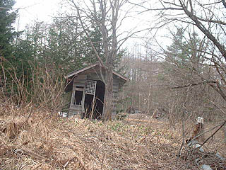 その西側には小さな小屋がありました。形状と地形図から判断した結果この建物は神社だということがわかりました。小学校よりもまだ原型を留めていました。