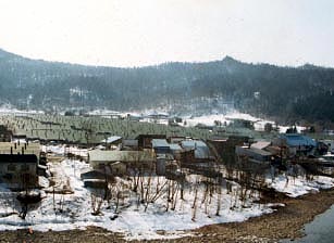 閉山直前の風景です。 冬の空に無数の蒸気が立ち上り、生活感が溢れています。 緑の屋根が一面に続く炭鉱住宅は壮観でした。