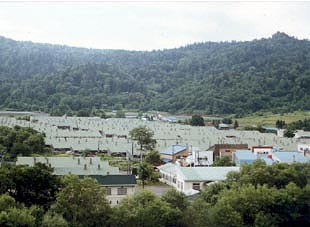 閉山後菊水町の炭鉱住宅街は1年の期限を持って使用することができました。 その猶予期間に撮影した写真です。 緑の屋根と周囲の緑が溶け込んでいる不思議な風景でした。