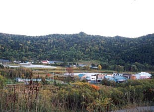 商店街は半数程度の建物が自然に崩れ無残な姿を晒していました。残る建物も住人がいる建物以外では劣化が進み今後数年の間にはその姿をとどめるのはわずかになってしまうことでしょう。閉山直後に炭鉱住宅があった場所にできたビニールハウスも今では緑に埋もれてしまっていますが奥の農家は健在な模様。商店街のすぐ近くにゲートボール場があり昼間は老人で賑わいます。