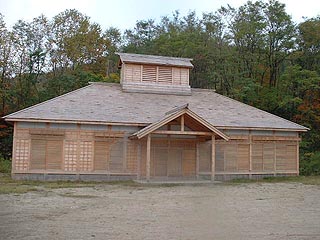 写真左は駐車場からの入口。正面の建物は馬小屋。