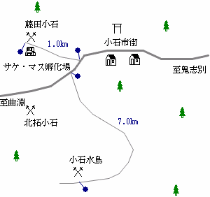 猿払村には中小の炭鉱が小石を中心に浅茅野、狩別、鬼志別などに点在していました。最も規模の大きかった炭鉱は小石市街西部に位置し北拓小石炭鉱と西北部に位置した藤田炭鉱です。北拓小石炭鉱は昭和22年に開鉱、最盛期の昭和38年には年間8万トンを産出しました。天北線沿いには側線にホッパーもあり、小さなズリ山もありました。昭和41年閉山。また藤田炭鉱は昭和22年に開鉱、最盛期の昭和37年には年間9万トンを産出しました。小石駅から専用線が炭鉱までありました。昭和41年閉山。その後も露天掘りの小石水島炭鉱が平成に入る頃まで操業をしていましたが、今はすべての炭鉱が閉山しました。