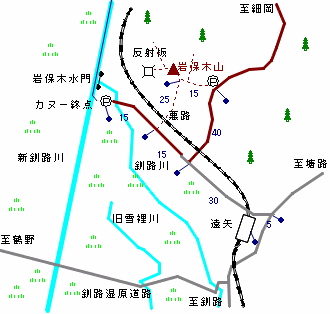 (交通:釧路-[釧網線11分]-遠矢-[徒歩70分]-岩保木山)