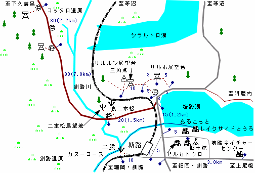 (釧網本線:釧路-[11分]-遠矢-[7分]-釧路湿原-[4分]-細岡-[9分]-塘路-[7分]-茅沼-[6分]-五十石-[7分]-標茶)