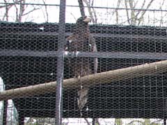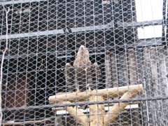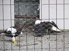 猛禽舎は昭和53年にオープンしました。正門から歩いてすぐにある最初の檻ですので必ず目に留まると思います。はやる気持ちを抑えてまずはここを覗いてみましょう。平成23年に改修が行われ、網目の拡大や止まり木が設置されています。 オオワシは地面の上を歩いていました。イヌワシは止まり木にいました。 オジロワシは鋭い目つきで周りを警戒していました。