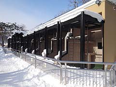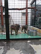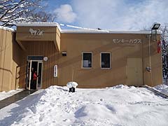 モンキーハウスは昭和59年に開設された熱帯系のサルを展示する小さな施設で屋内と屋外に檻があり冬期でも見学が可能です。白と黒の対比が美しいエリマキキツネザルやアフリカに生息しているマンドリルなどもいます。最近外観だけ塗り直しがされ、見た目は一新されました。 屋内通路からサルを眺めます。写真中のワオキツネザルは木の枝の上を飛び回っていました。写真右のフサオマキザルは食事中でした。 屋外の展示施設の冬の風景。