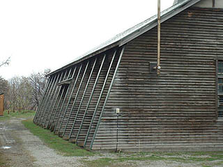 外観からもその独特な構造がわかる体育館。体育館は柱のない大空間が要求されるために構造に工夫が要求されます。壁面の強化のための控え壁がそのひとつでずらりと並ぶ様は壮観です。また屋根が木造トラスで支えられているのもその工夫のひとつ。中を覗くとその複雑な様相を見ることができます。