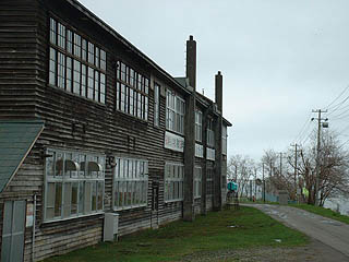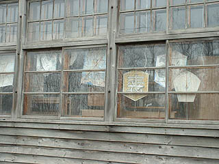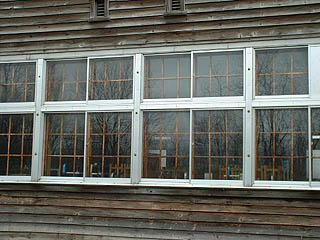 写真左は道路側の校舎。写真右は校庭側と道路側の角。壁面の板は下見板張りで当時の学校建築、工場建築の流行もの。