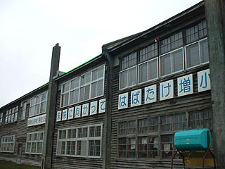 増毛小学校の現校舎は昭和11年に新築された木造校舎です。特筆されるのはその規模で中央に中庭を配し、周りをぐるりと木造2階建て校舎と体育館が囲んでいる形態で約1,000人もの児童を収容できるものでした。小規模な木造校舎は今でも道内に散見されますがこれだけ大規模な木造校舎がほぼ建造当時のまま一体となって残っている事例はありません。残念ながら現在では通う児童数も200余名となっています。増毛の駅周辺の町並みからは少しはずれた高台の上にありますが併せて訪問しておきたい場所といえるでしょう。今でも現役校ということで中に入ることはできませんが外観を見学することはできます。ちなみにこの校舎の紹介文によく出てくる戦前期の都市型木造校舎という表現はどこにでてくるものなのでしょう。