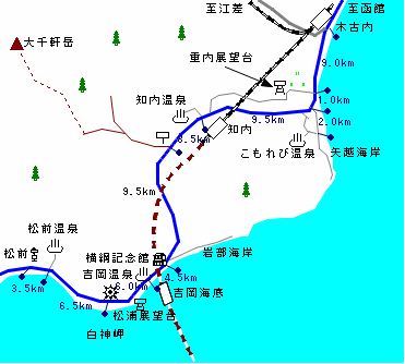 (交通:木古内-[バス15分]-知内-[バス38分]-福島-[バス42分]-松前)