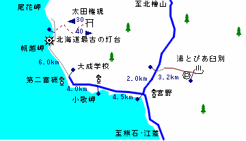 (交通:江差-[バス116分]-大成学校前-[バス7分・1日1往復・4km]-第二富磯-[3.5km]-帆越岬-[2.5km]-太田権現入り口)