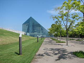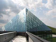 ガラスのピラミッドはモエレ沼公園のメイン施設です。ガラス張りのピラミッドの外観は大変美しい。室内にはイサム・ノグチのギャラリー、ミュージアムショップ、フランス料理の本格レストラン、軽食を買うことができるテイクアウトショップなどが入っています。またピラミッドの上部には展望回廊があり、モエレ沼とその周辺の眺望を楽しむことができます。夜は週末と夏のシーズンは21時まで営業していて、ライトアップされたガラスのピラミッドを訪れることも可能です。