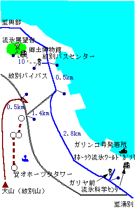 (交通:交通:名寄-バス[130分]-紋別-バス[7分]-ガリヤ前-バス[35分]-中湧別-遠軽)