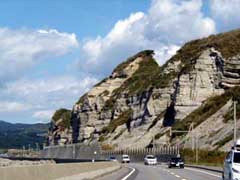 国道229号線をはしると数多くの有名無名な岬を通過していきますが、その中でも最も特徴的な岬が館ノ岬です。地層の浮き出た海岸段丘は白く美しくはっとさせられるものがあります。地中海の海岸線のようだとかグランドキャニオンのようだとか書かれている紹介も目にしますがそれは言い過ぎにしてもなかなかのものです。