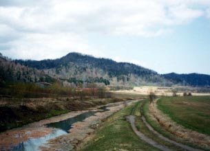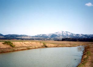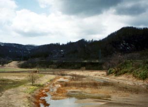 ■旧佐藤の沼その1 瀬尾の沼から北へ向かいたどり着く佐藤の沼の南に架かる橋からの風景です。 佐藤の沼と国道40号を隔てた金見の沼はそのほとんどが牧草地に変わっていました。 わずかに細い水路が残され、よどんだ水が溜まっています。