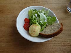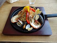 メニューを眺め食事メニューの「海のパエリア」のセットとスイーツの「エゾアムプリン」を注文しました。注文した後は店の本を読みながら時間を過ごします。まずサラダとそばパンが到着しました。そしてメインの海のパエリアが鉄板に載って登場。具と絡まった炊込みのごはんが非常に美味で、時々えび、貝をつつきながら頂きました。