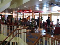 マーメイドクラブはホテルのロビーの喫茶という雰囲気の場所です。クルーズでは写真左のようにピアノの生演奏を楽しむことができますが人の往来も多く少々さわがしい。生ビールとソフトアイスは有料ですがコーヒー、ジュースは無料です。枝豆、ポテトの2種類のおつまみもどさっとカウンターに無料で用意されていました。