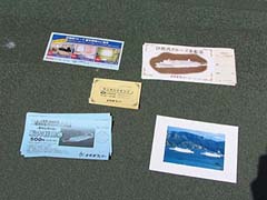 手続き時に渡されたもの一式。写真左は伊勢湾ランチバイキングクルーズ用の船内案内図です。船内で開催されるイベントの時間が掲載されています。写真右は伊勢湾クルーズ乗船券、ランチバイキングチケット、伊勢湾クルーズ船室利用のご案内、船内利用500円券絵葉書の5点です。伊勢湾クルーズ乗船券は乗船時に半券を切り取ります。ランチバイキングチケットはランチバイキングの時間が指定されたチケットでバイキングのレストランにて係員に手渡します。船内利用500円券はニューきそ就航、きたかみグランドリニューアルを記念した一時的なものかもしれませんが店内の売店にて利用ができました。