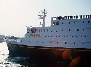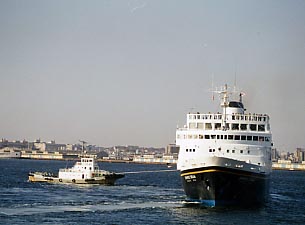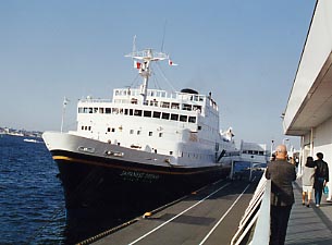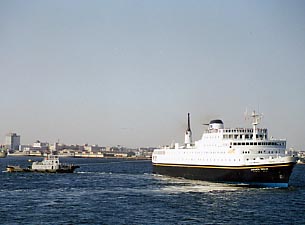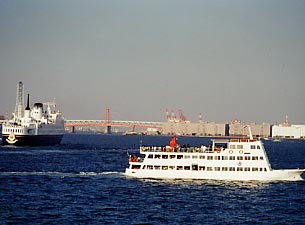 横浜港に入港するJAPANESE DREAM。タグボートが青函連絡船当時の入港風景をよみがえらせます。ベイブリッジとの取り合わせも格別です。