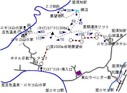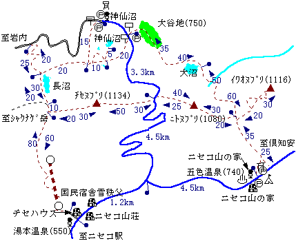 (交通:ニセコ駅-[バス27分]-湯本温泉-[バス12分]-ニセコ山の家/湯本温泉-[バス20分]-神仙沼)