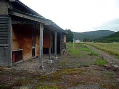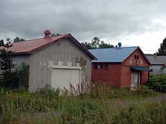 写真左は駅前通りのもの。歯抜けにはなっているが駅前の雰囲気を保っています。写真右は駅前に今も残る倉庫。沼牛駅は貨物取り扱い駅であったため農作物の集積所としての機能もあったことを今に伝えます。