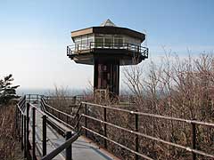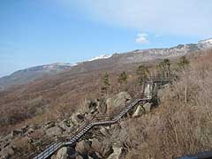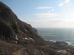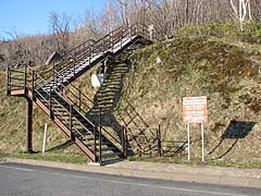 雄冬岬展望台は平成11年にできた展望台で、雄冬市街から舗装道路を上ると駐車場があり、ここから鉄骨の階段を上っていくことになります。岩石の中を通る楽しい散策路ですが、夏にはマムシが大量に出てくるので注意が必要です。周回道路となっていましたが展望台から先は通行止めでした。