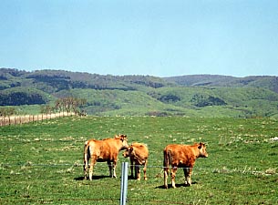■青苗の先の牧場 青苗からの西海岸の道は険しい海岸線に寄り添うように進みます。しかしながら青苗の集落を出発してからの一時だけは温和な丘陵地を通っていきます。そしてそんな道の脇には牧草地が広がります。