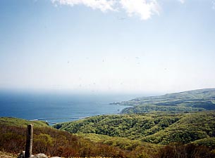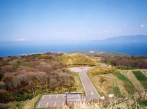 ■丘からの展望 駐車場に車を置き少しだけ階段を上ると奥尻島の北部を見渡すことができる展望地に着きます。遠く北海道本土も望むことができ周りも大きな木はなく開放的な風景が広がります。
