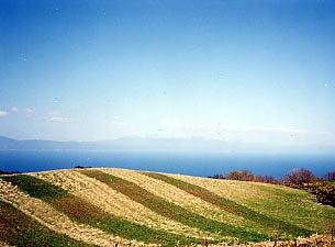 ■丘と海と牧草地 奥尻でこんな風景が楽しめるのは球浦開拓の一帯の牧草地とここだけです。車で奥尻を回るときには行っておきたいポイントです。