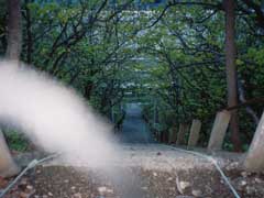 最初に鳥居をくぐるといきなり急登の石段が出現します。安全のためロープも張ってありました。(写真の白いものはリュックのベルト。)