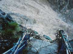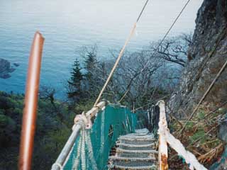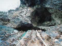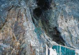 さらに20分程で崩れた崖に洞窟が見えてきます。崖には空中を歩くかのようなネットで覆われた架設の橋が架けられています。橋を渡ると洞窟から鉄の輪でできた鎖とロープが垂れていてこれをさらに登っていくことになります。