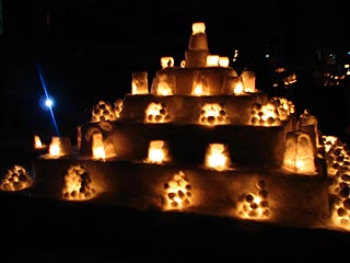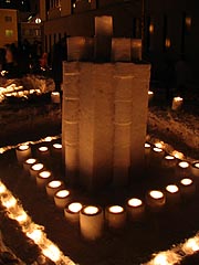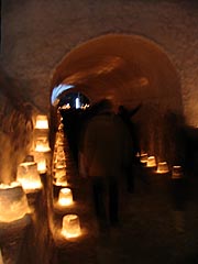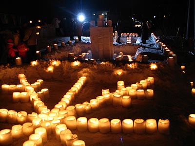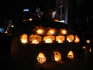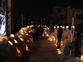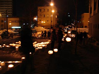 日銀通り南側にある手宮線会場のアクセントになっているスノートンネル。観光ガイドを見ると明かりはトンネルの中には両端と中央の3列灯っていたのですが実際には両端の2列でした。トンネルは実はすべてが雪で作られたものではありません。通ったときに観察してみましょう。