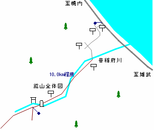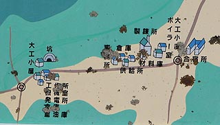 鉱山中枢はその上流に離れて位置していました。地図には合宿所、大工小屋、ボイラー室、精錬所、材料庫、倉庫、供給所、事務所、坑、大工小屋、工作所、機械室、発電所、倉庫、重油庫の記載があります。