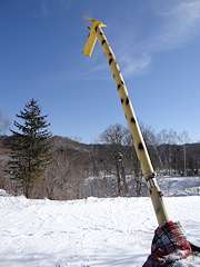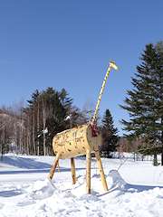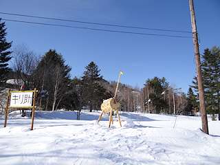 試験湛水では一旦体が水に浸かったキリ助ですが、辺りは普段から水に浸かる可能性の少ない場所なので、今も生き生きした木々の中にキリ助は佇んでいました。新国道からは先人の方の雪かきの跡があり、思いのほか容易に間近まで行くことができました。 背中の雪をのけ元気になったキリ助です。